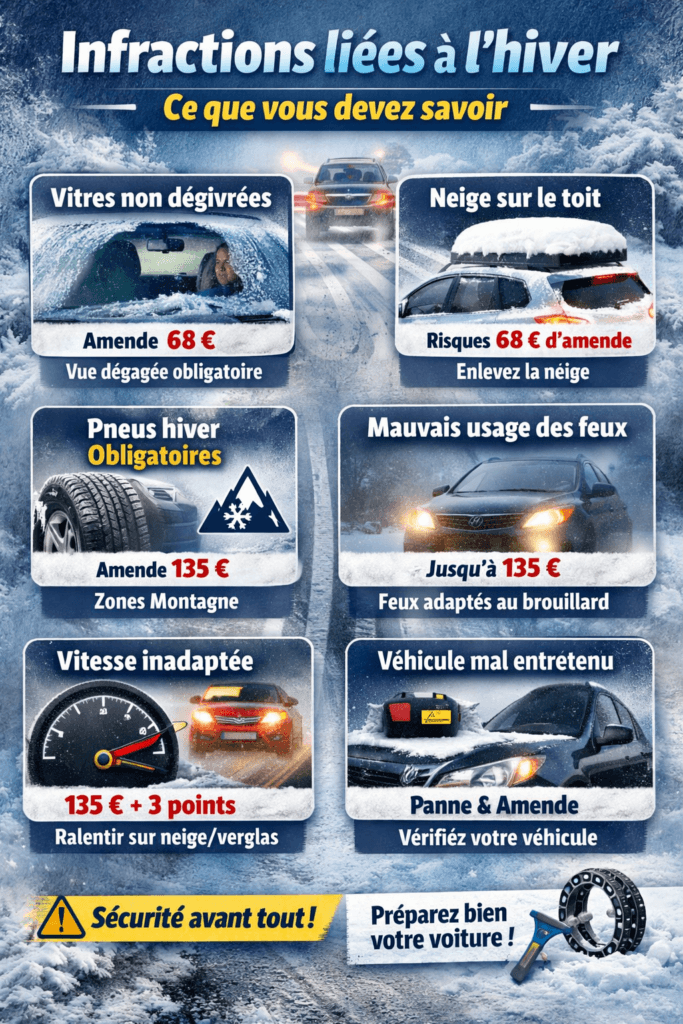 Voici un tour d’horizon clair des infractions hivernales les plus fréquentes, leurs sanctions, et les bons réflexes à adopter.